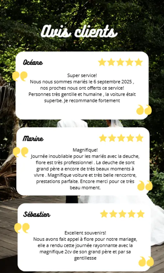 Hello, je m'appelle Flore, et je vous propose un service unique et plein de charme : la location de ma 2CV vintage, accompagnée de mes services de conductrice, pour vos événements spéciaux ou de jolies balades dans le Marais Poitevin. Que ce soit pour un mariage, un anniversaire, une séance photo, ou simplement l’envie d’une escapade rétro, embarquez à bord d'une voiture mythique qui fait sourire petits et grands.